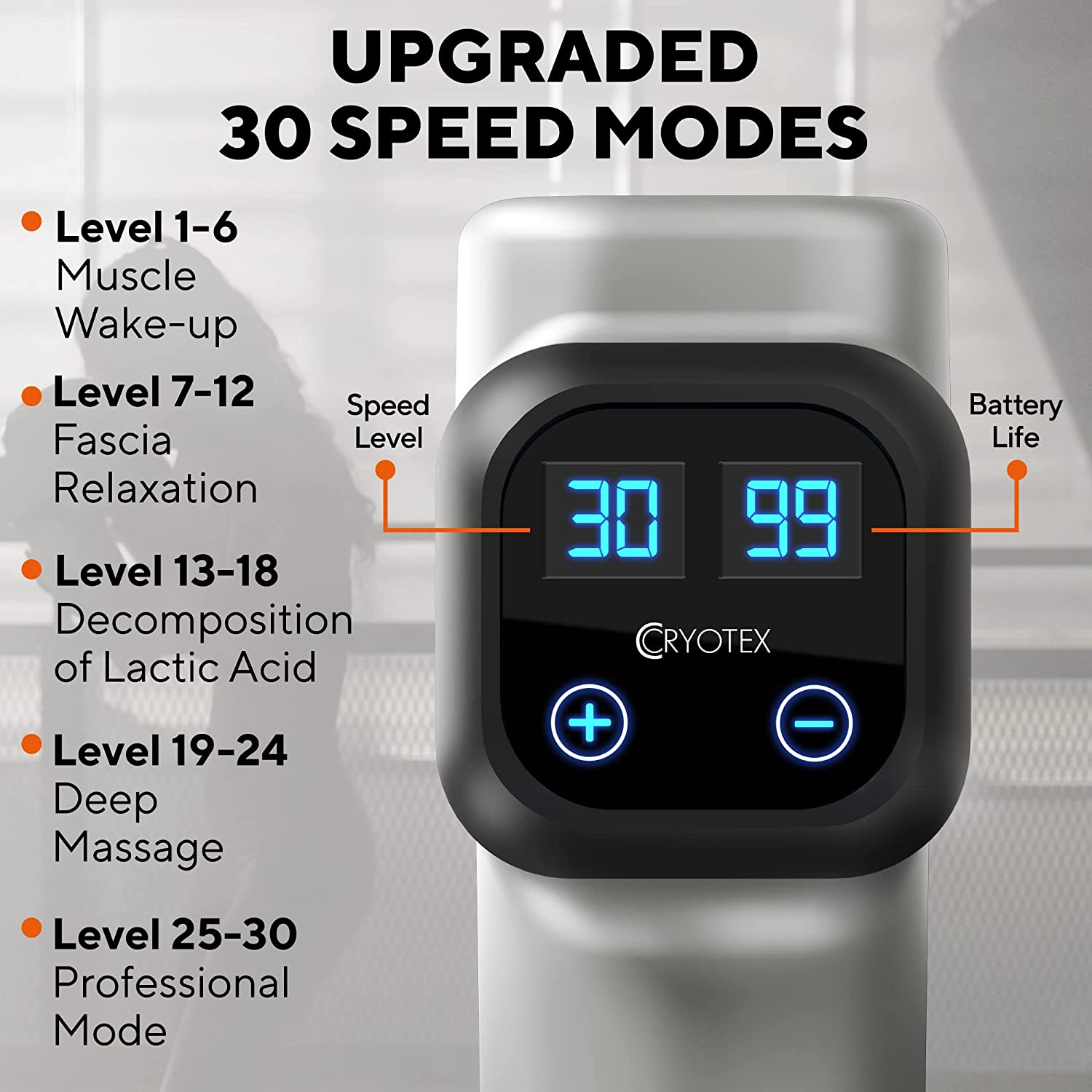 Turn on your Cryotex Massage Gun and choose your preferred intensity level (1–20). Start low and gradually increase the speed as your muscles warm up.